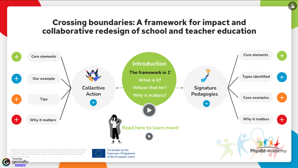 As the final outcome of our three-years of work, we present the “PhysEd-Academy Framework”, entitled: “Crossing boundaries: A framework for impact and collaborative redesign of school and teacher education”.
